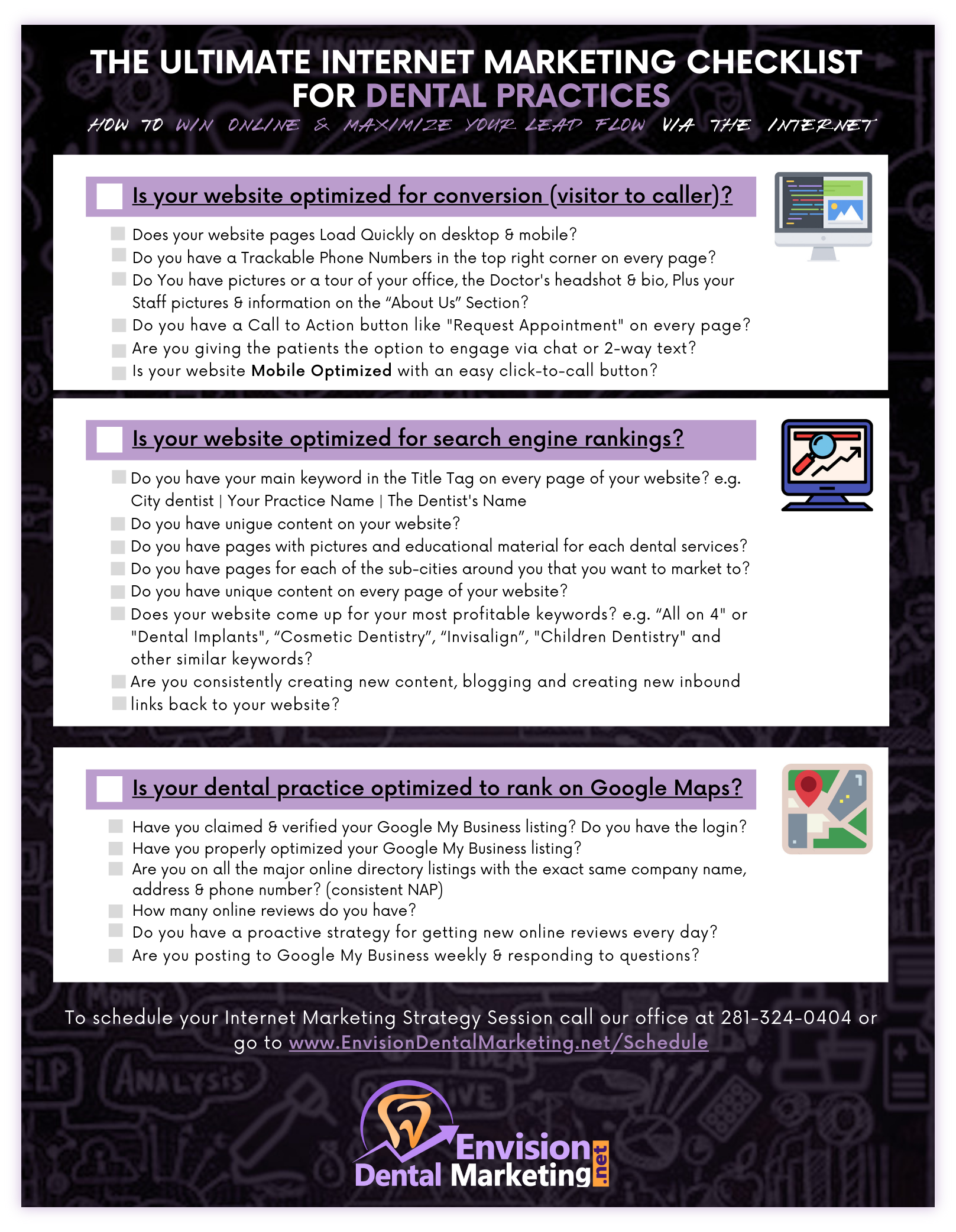 How to increase your new patient count by improving your Online Presence and fine tuning your Digital Marketing Strategies. This Guide & Checklist will help you identify what is missing from your current strategy and what you must focus on next to take your practice to the next level.