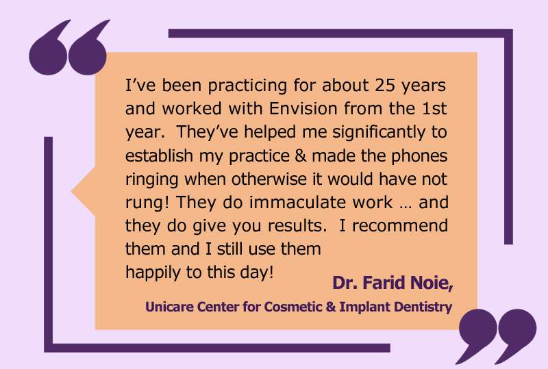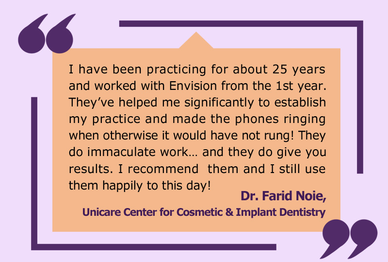 Envision Dental Marketing is the leading provider of marketing strategies for cosmetic, implant and general dental practices. Our firm has experience with working with dental practices in many markets for over 25 years. Whatever your specialty or area, we’ve already been there, and are ready to serve you! We are here to help you market more effectively — we help you maximize ROI on each sales and marketing dollar you spend.